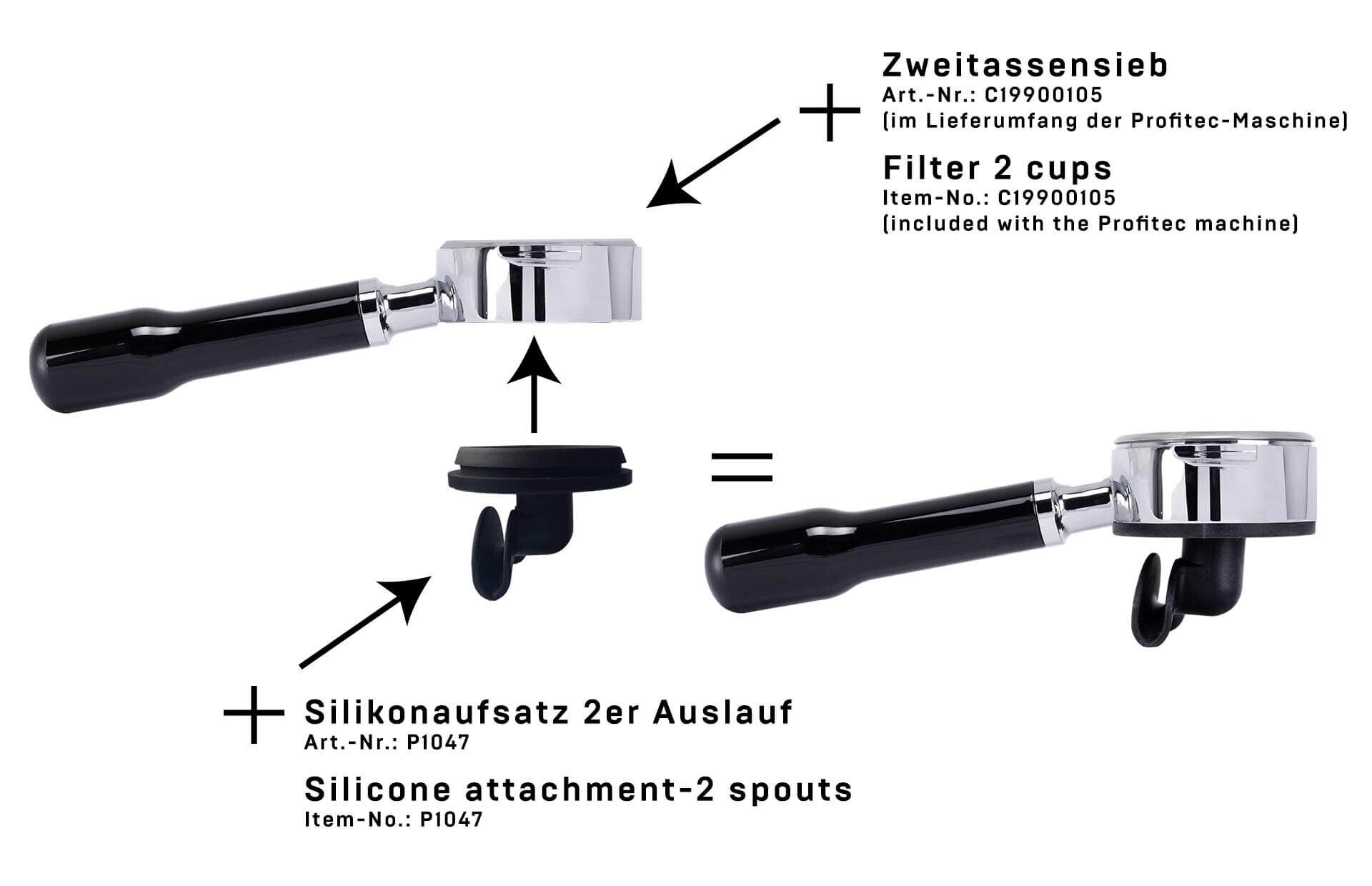 De bodemloze filterdrager kan modulair worden gebruikt, met het siliconen opzetstuk - dubbele uitloop en het filterbakje voor 2 kopjes, dat wordt meegeleverd met je Profitec machine, verander je de filterdrager eenvoudig in een filterdrager met dubbele uitloop.