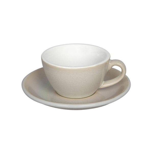 De Loveramics Egg Schotel 14,5 cm past zowel bij de Cappuccino koppen 200 ml als de Flat White/Lungo koppen 150ml.