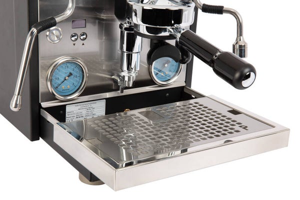 En dan is er nog het uiterlijk: De elegante matzwarte zijpanelen steken af tegen de satin-finish voorkant, het kopjesplateau en de zilverkleurige lekbak. De drukmeters harmoniëren met het display en ronden het uiterlijk af.